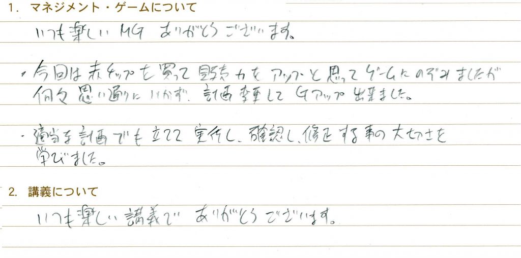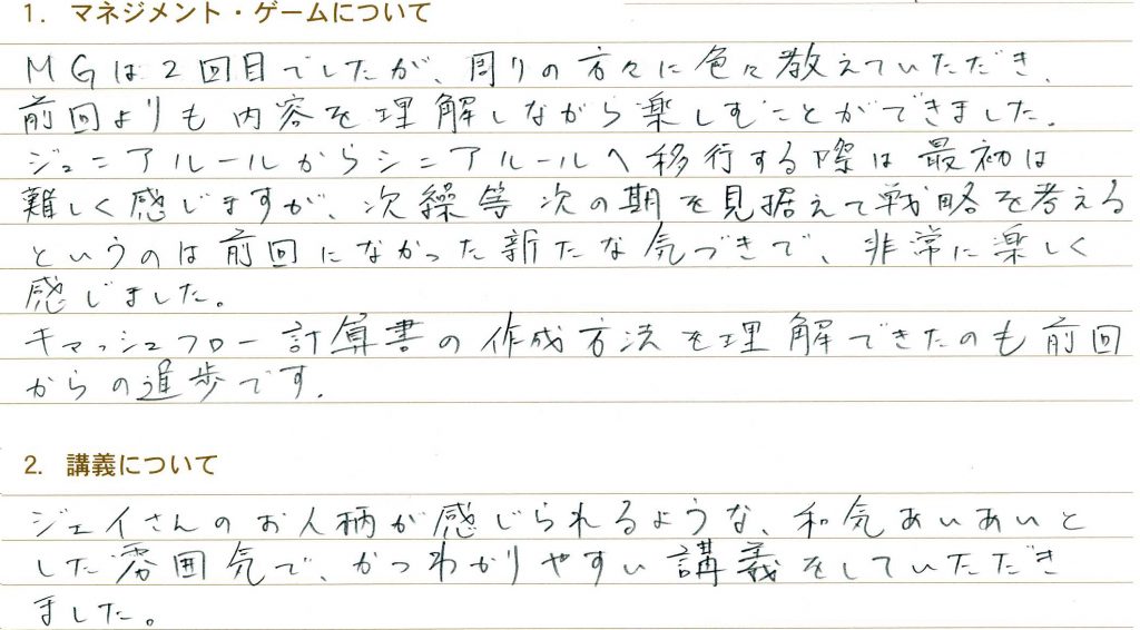 MGは2回目でしたが、周りの方々に色々教えていただき、前回よりも内容を理解しながら楽しむことができました。ジュニアルールからシニアルールへ移行する際は最初は難しく感じますが、次繰等次の期を見据えて戦略を考えるというのは前回になかった新たな気づきで、非常に楽しく感じました。キャッシュフロー計算書の作成方法を理解できたのも前回からの進歩です。