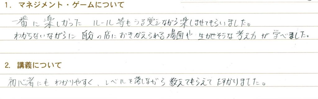 一番に楽しかった ルール等もうる覚えながら楽しませてもらいました。分からないながらに自分の店に置き換えられる場面や生かせそうな考え方が学べました。