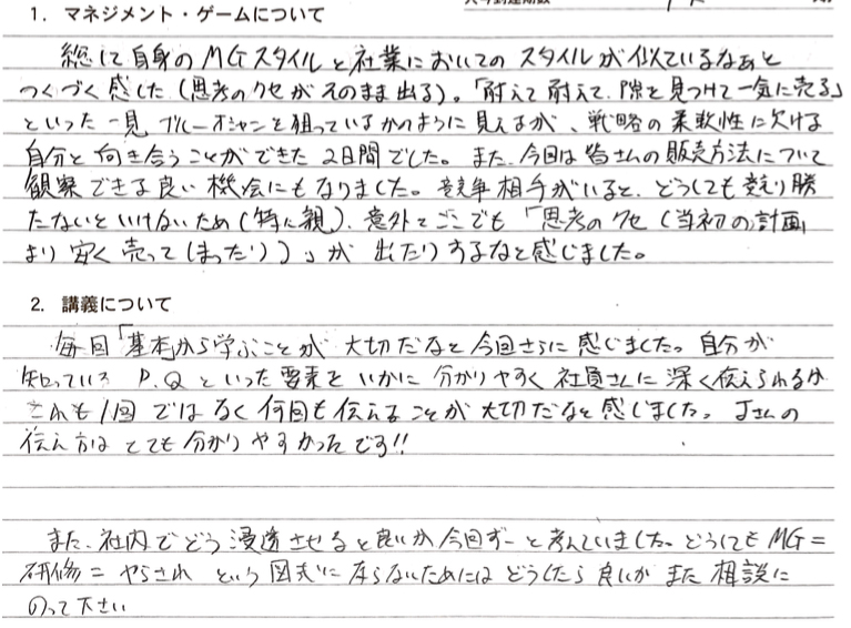 総じて自身のMGスタイルと社業においてのスタイルが似ているなぁとつくづく感じた(思考のクセがそのまま出る)。「耐えて耐えて隙を見つけて一気に売る」といった一見ブルーオーシャンを狙っているかのように見えるが、戦略の柔軟性に欠ける自分と向き合うことができた2日間でした。また今回は皆さんの販売方法について観察できる良い機会にもなりました。競争相手がいるとどうしても競り勝たないといけないため(特に親)、意外とここでも「思考のクセ(当初の計画より安く売ってしまったり)」が出たりするなと感じました。