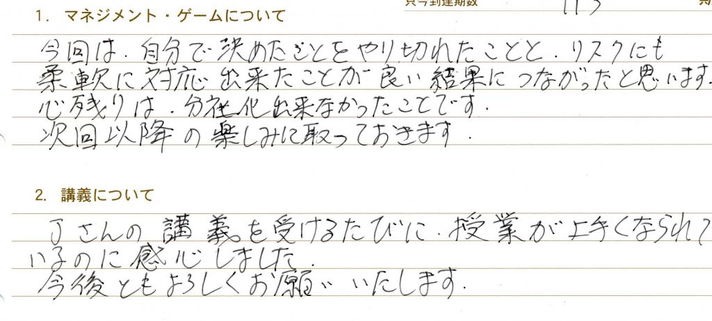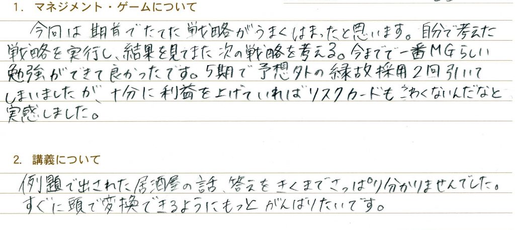 今回のマネジメントゲームでは、3期からシニアで資金も不足していたこともあリ、いつも通りの戦略ではGがでないだろうと思い、おもいきって戦略をいつもと変えてみたところ、4期5期とGが出て嬉しかったです。MGの美しく=あきらめない心というのが分かったように思います。また3.5期はいままでのマネジメントゲームの中でも楽しい交流会となりました。ゲームを通して視点を変えることの大切さが分かりました。