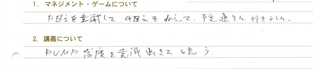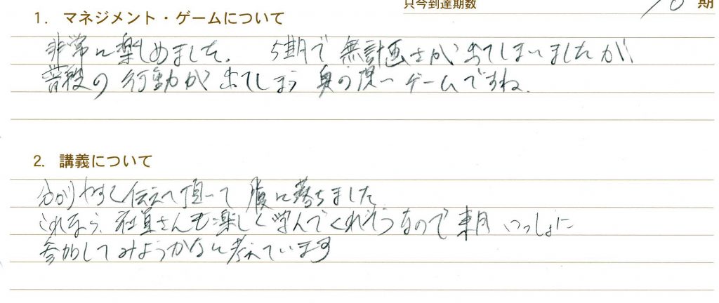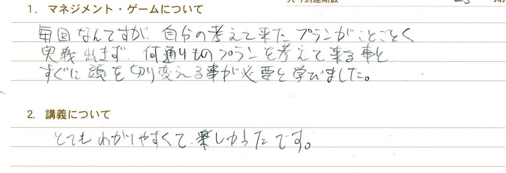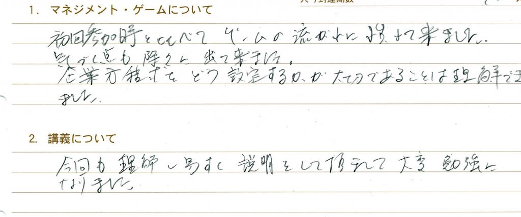 初回参加時と比べてゲームの流れに慣れてきました。気づく点も徐々に出てきました。企業方程式をどう設定するかが大切であることは理解できました。