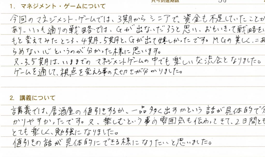 講義では居酒屋の値引きするか、一品多く出すかという話が具体的で分かりやすかったです。又、楽しく勉強になりました。値引きの話が具体的に出来るようになりたいと思いました。
