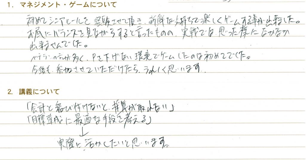 「会計と結び付けないと採算が取れない」「目標達成に最適な手段を考える」→実際に活かしたいと思います。