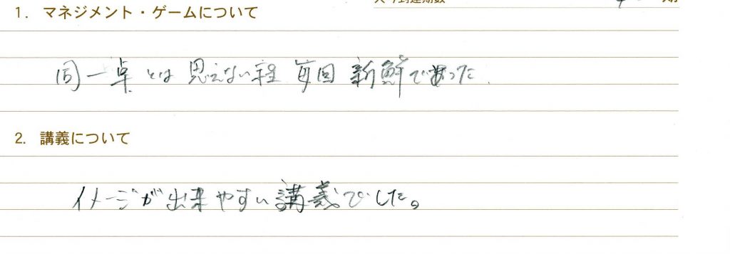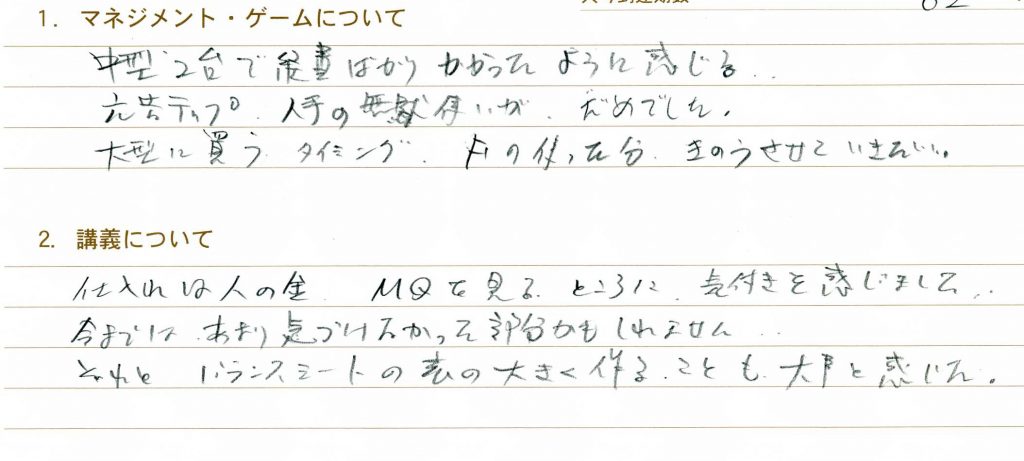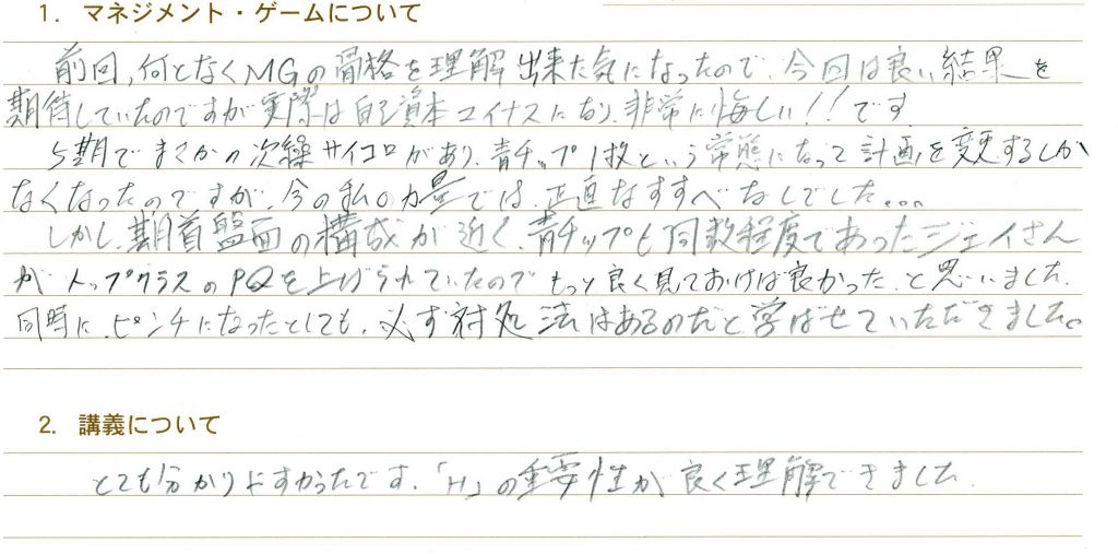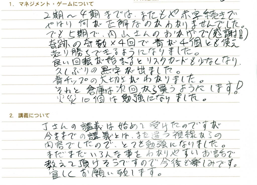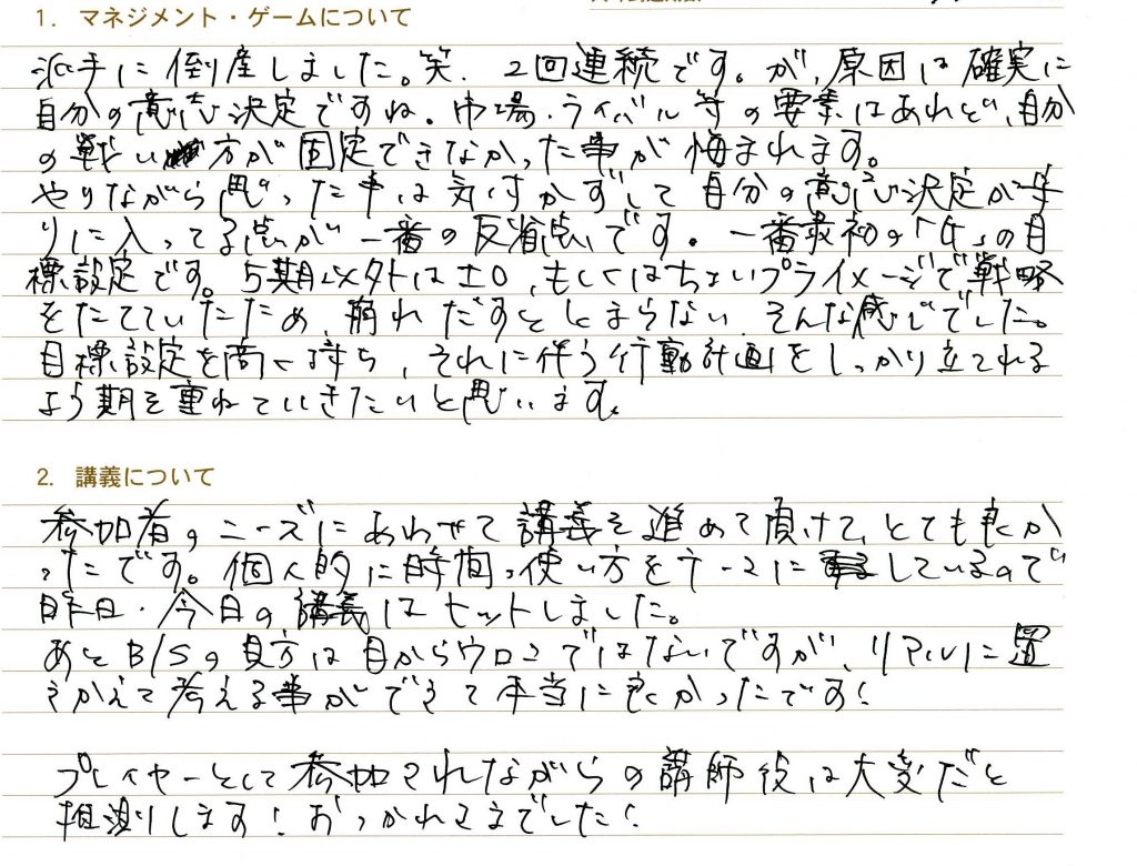 参加者のニーズにあわせて講義を進めて頂けてとても良かったです。個人的に時間の使い方をテーマにしているので、昨日今日の講義はヒットしました。あとB/Sの見方は目からウロコではないですが、リアルに置き換えて考えることが出来て本当に良かったです!