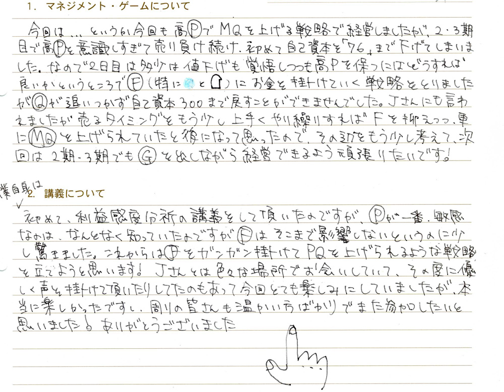 僕自身は初めて利益感度分析の講義をして頂いたのですが、Pが一番敏感なのはなんとなく知っていたのですが、Fはそこまで影響しないというのに少し驚きました。これからはFをガンガン掛けてPQを上げられるような戦略を立てようと思います!Jさんとは色々な場所でお会いしていて、その度に優しく声を掛けて頂いたりしてたのもあって今回とても楽しみにしていましたが、本当に楽しかったです。周りの皆さんも温かい方ばかりでまた参加したいと思いました!ありがとうございました