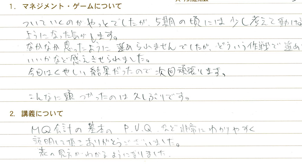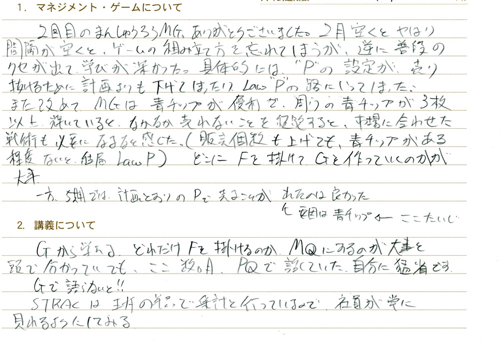 今回のMGは大変学びが多くありました。リスクカードに対するモチベーションの持ち方、経営計画の重要性、バランス感覚の大切さなど、次に活かしたいです。