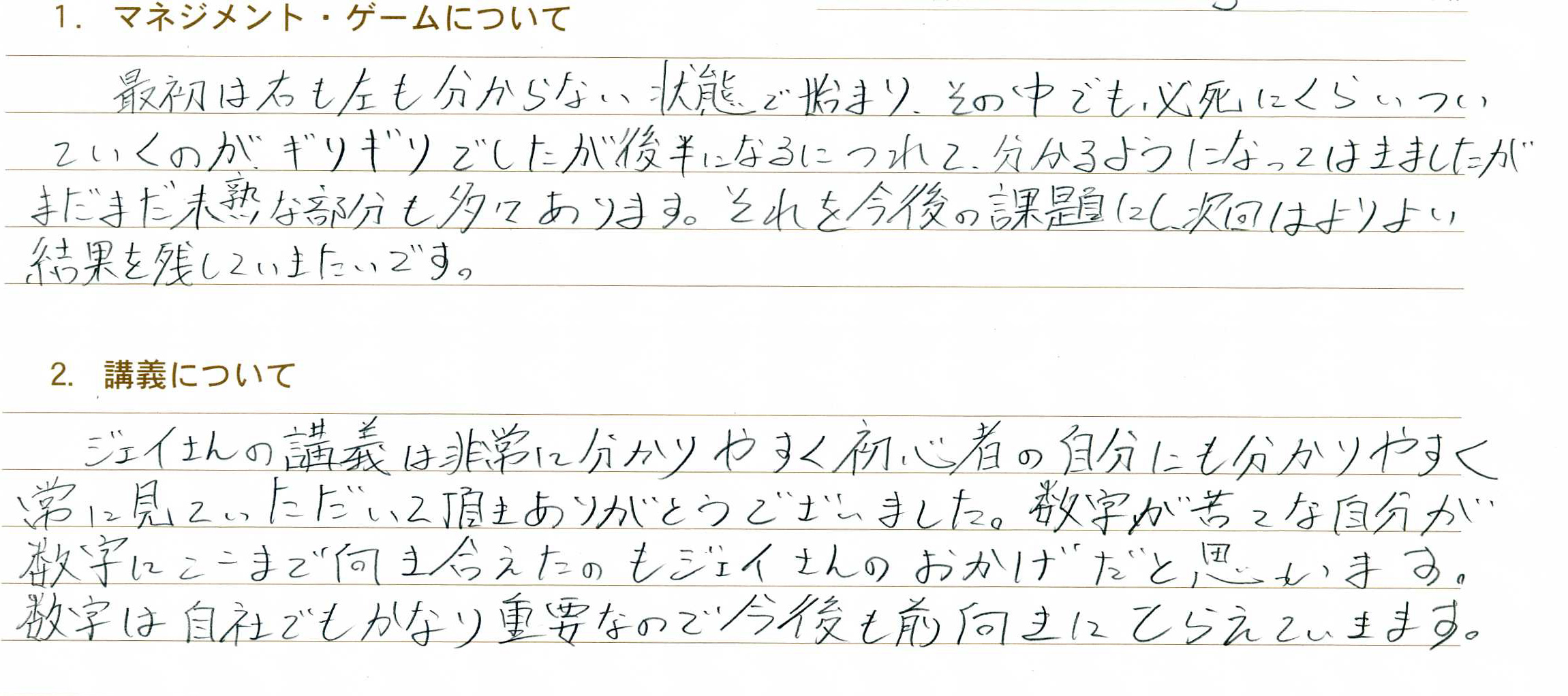 ジェイさんの講義は非常に分かりやすく初心者の自分にも分かりやすく常に見て頂きありがとうございました。数字が苦手な自分が数字にここまで向き合えたのもジェイさんのおかげだと思います。数字は自社でもかなり重要なので今後も前向きにとらえていきます。