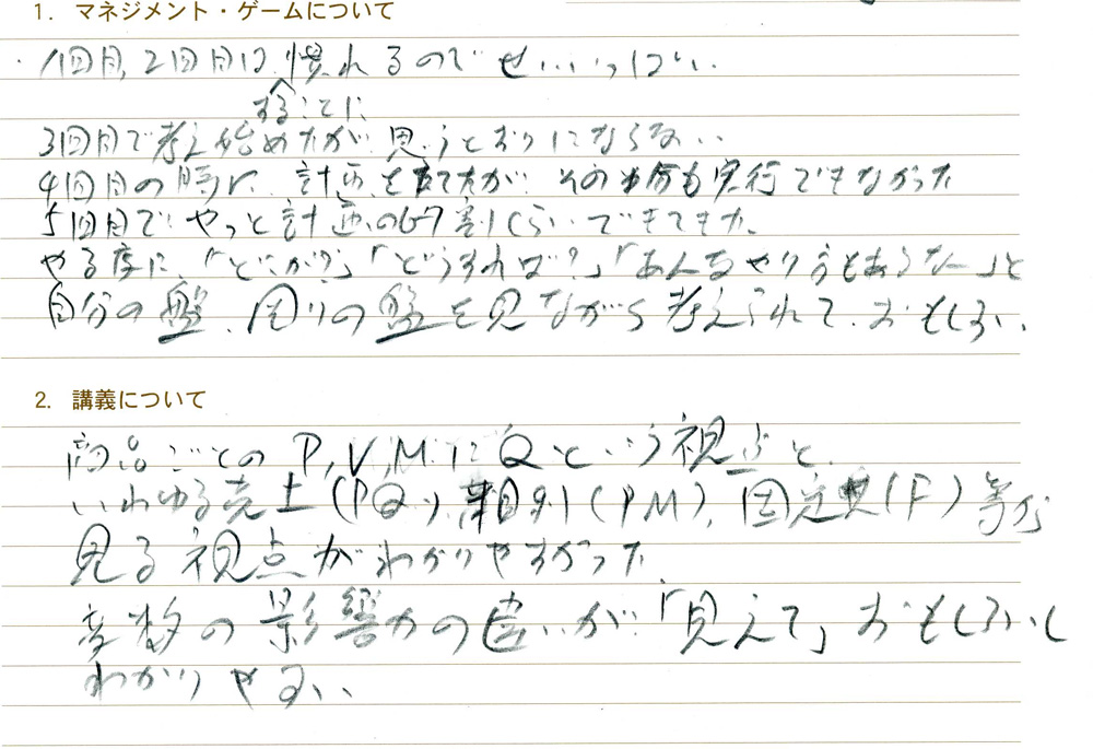 前回より落ち着いてゲームが出来た。販売数が伸ばすことが出来ずに苦戦した。4期目に初めてGが出せたのでうれしかった。