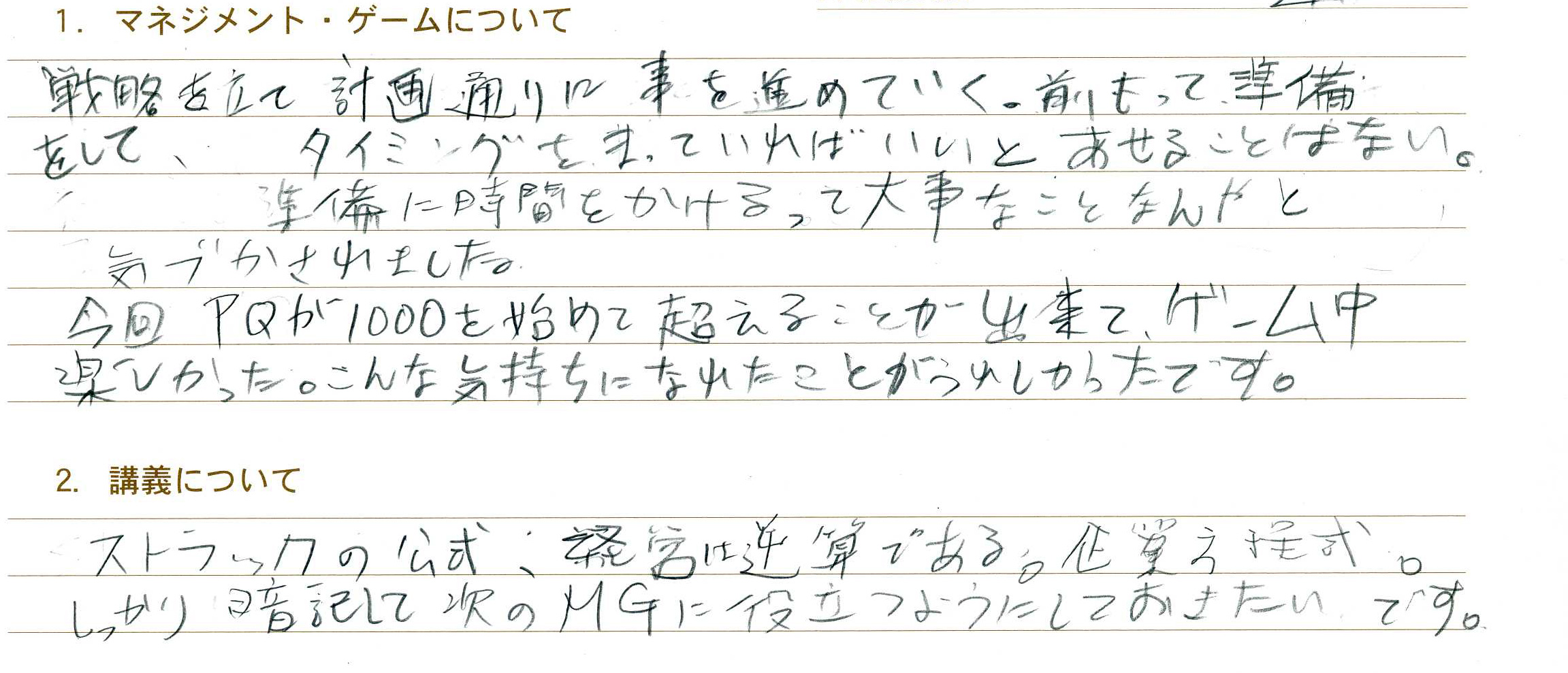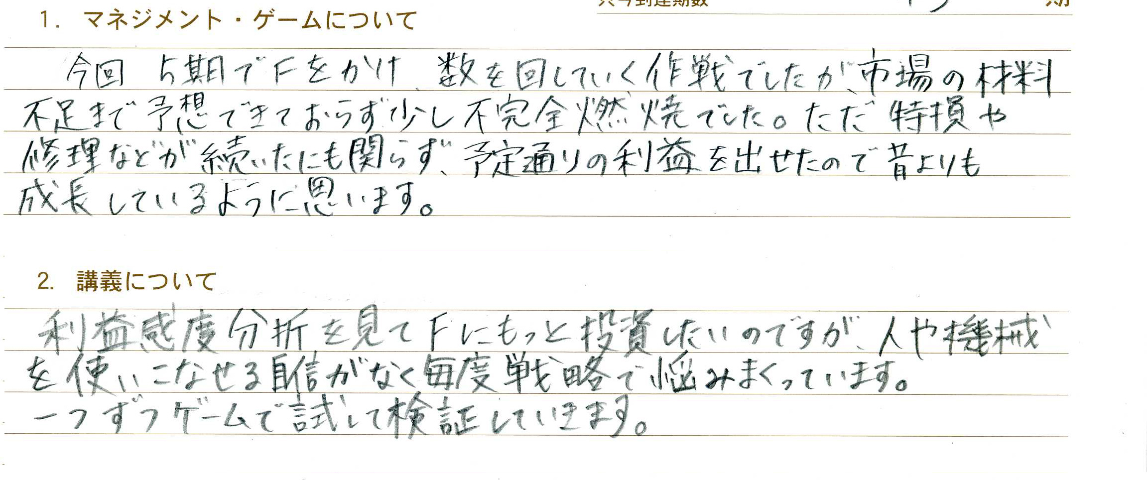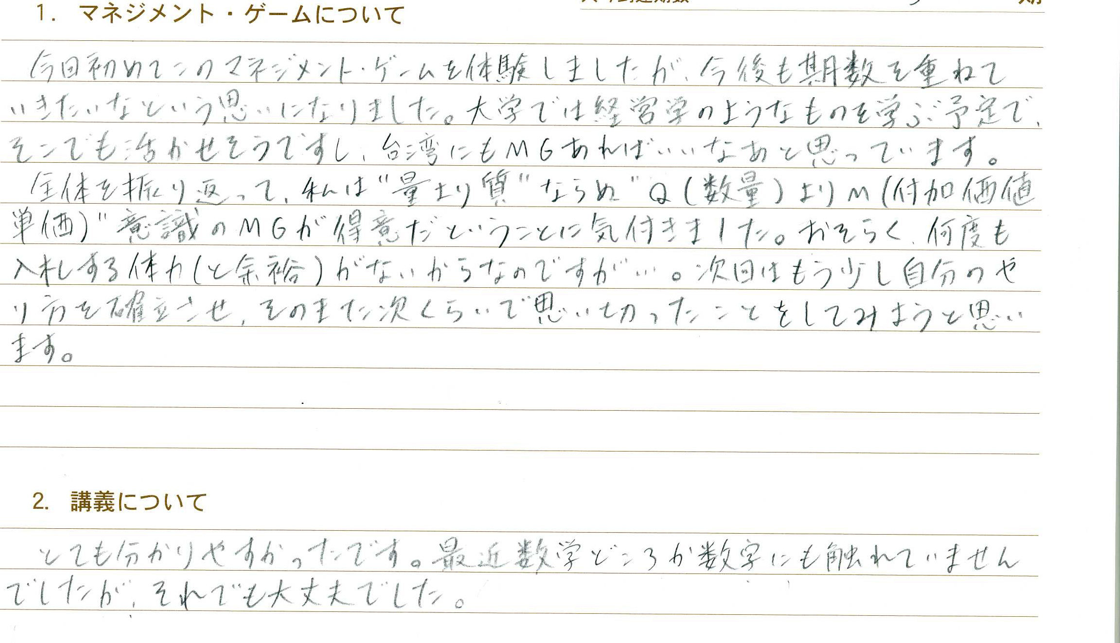 今回初めてこのマネジメントゲームを体験しましたが、今後も期数を重ねていきたいなという思いになりました。大学では経営学のようなものを学ぶ予定で、そこでも活かせそうですし、台湾にもMGがあればいいなぁと思っています。全体を振り返って私は“量より質”ならぬ“Q(数量)よりM(付加価値単価)”意識のMGが得意だということに気付きました。おそらく何度も入札する体力(と余裕)がないからなのですが…。次回はもう少し自分のやり方を確立させ、そのまた次くらいで思い切ったことをしてみようと思います。