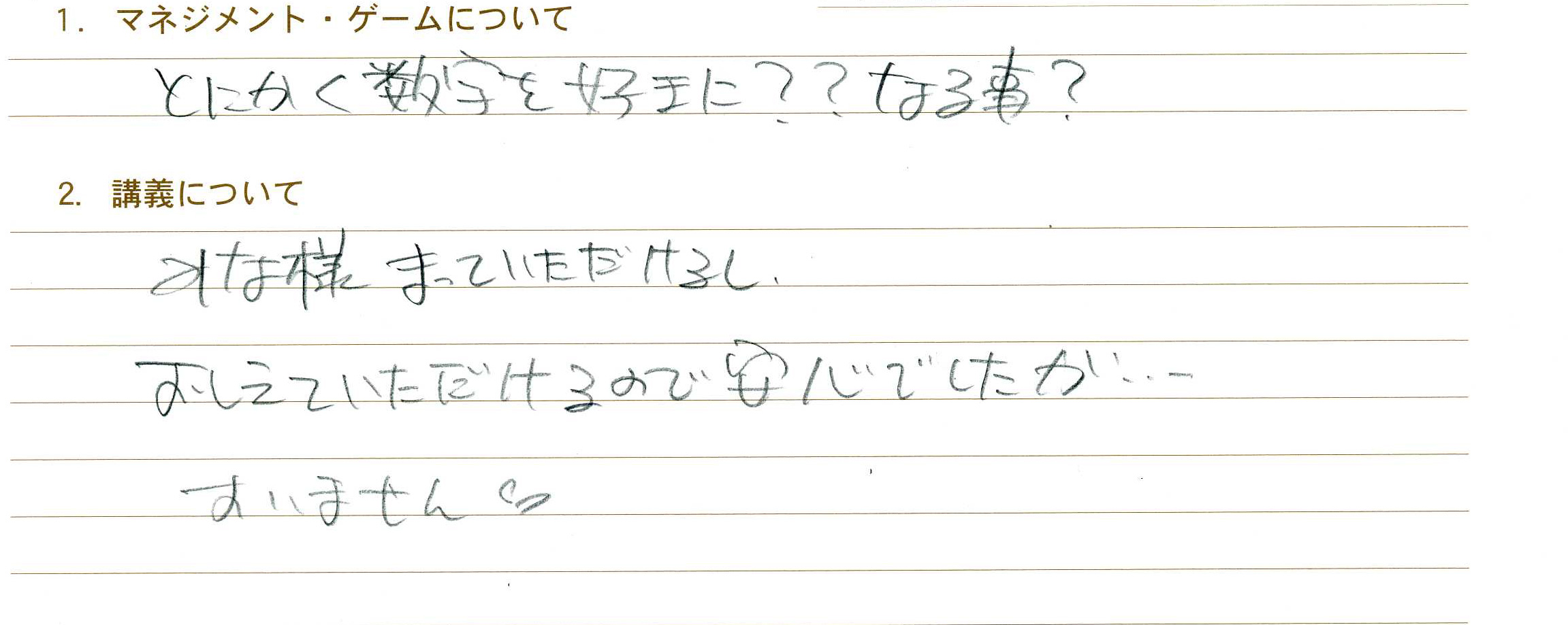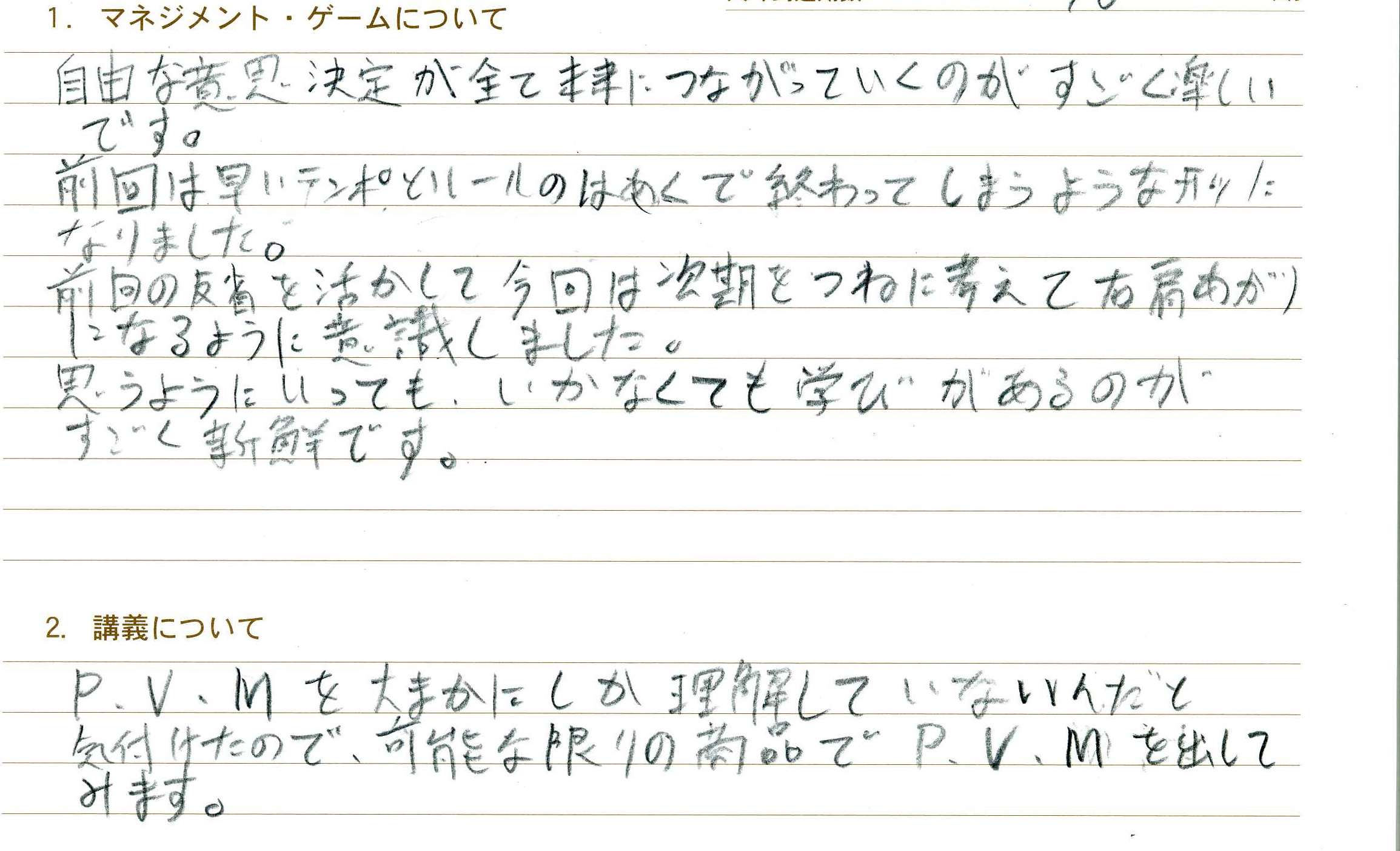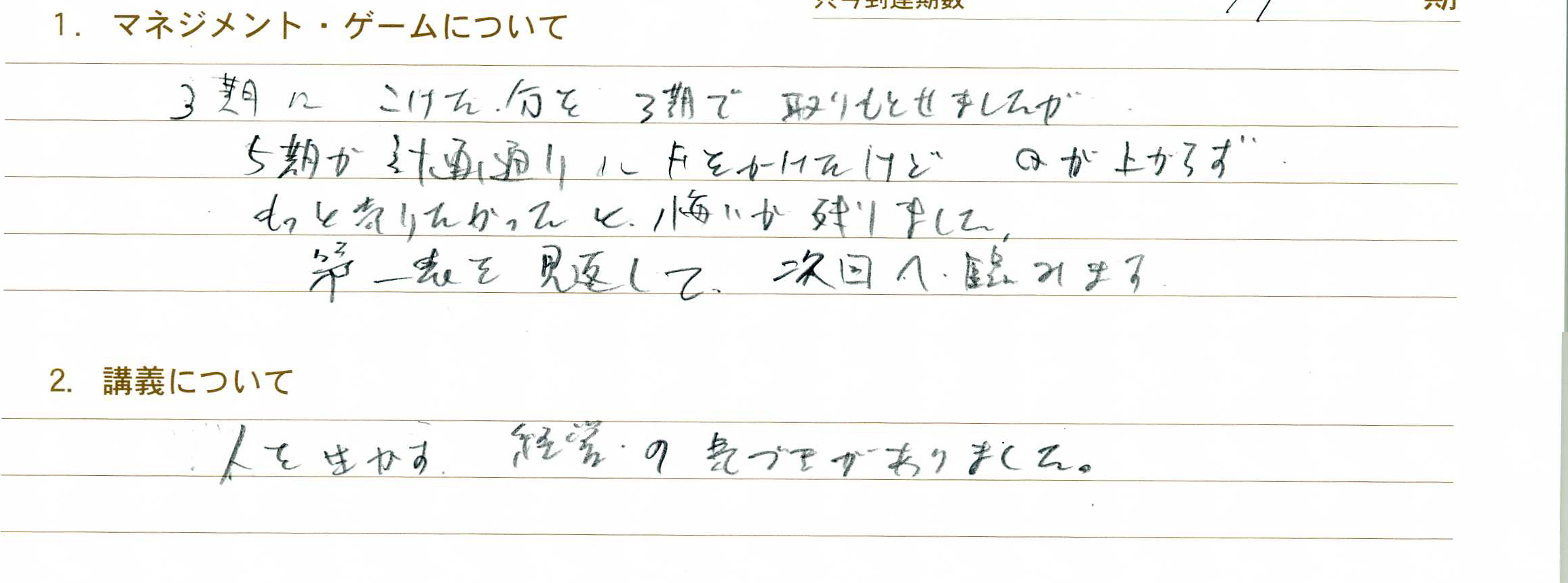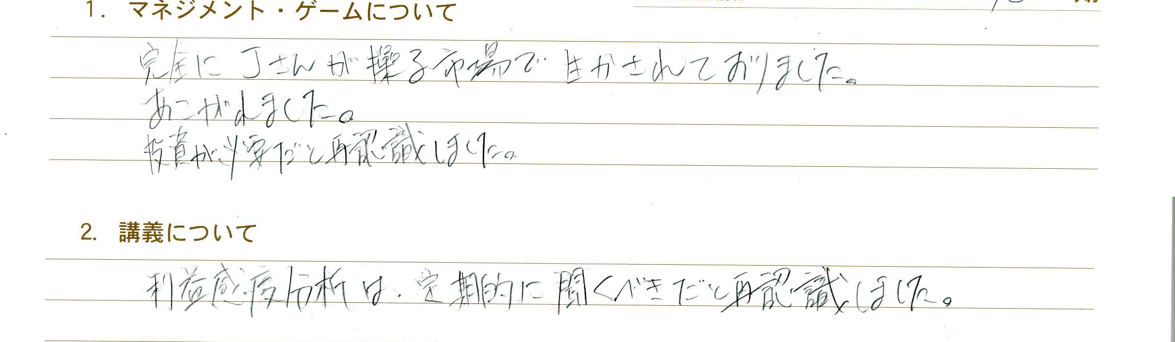 今回初めてこのマネジメントゲームを体験しましたが、今後も期数を重ねていきたいなという思いになりました。大学では経営学のようなものを学ぶ予定で、そこでも活かせそうですし、台湾にもMGがあればいいなぁと思っています。全体を振り返って私は“量より質”ならぬ“Q(数量)よりM(付加価値単価)”意識のMGが得意だということに気付きました。おそらく何度も入札する体力(と余裕)がないからなのですが…。次回はもう少し自分のやり方を確立させ、そのまた次くらいで思い切ったことをしてみようと思います。