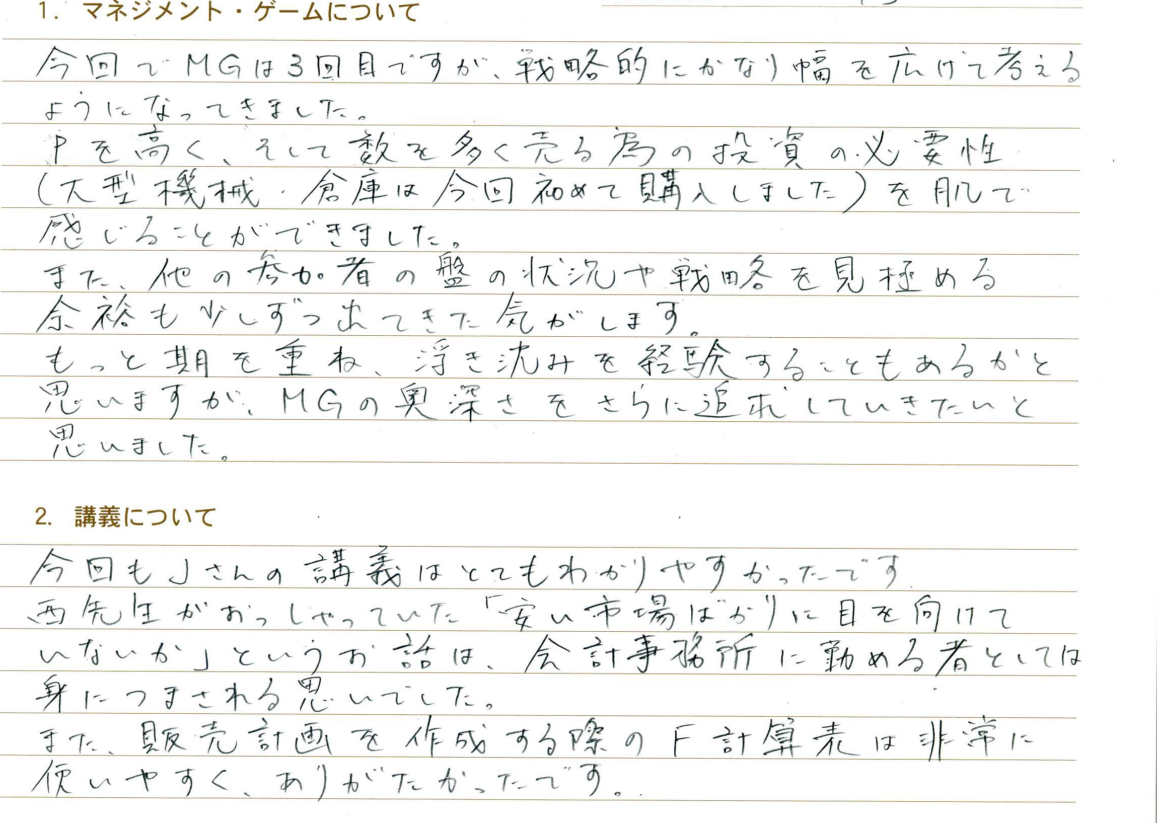 今回もJさんの講義はとてもわかりやすかったです。西先生がおっしゃっていた「安い市場ばかりに目を向けていないか」というお話は、会計事務所に務める者としては身につまされる思いでした。また販売計画を作成する際のF計算表は非常に使いやすくありがたかったです。