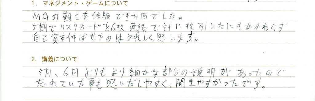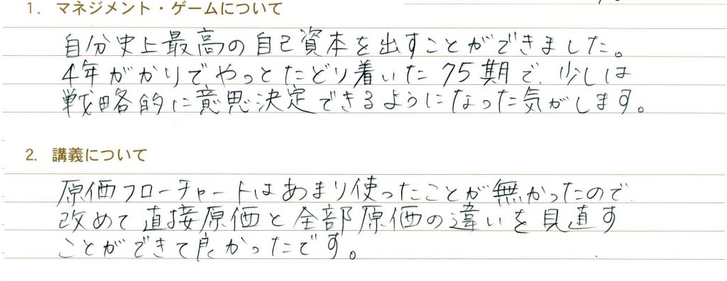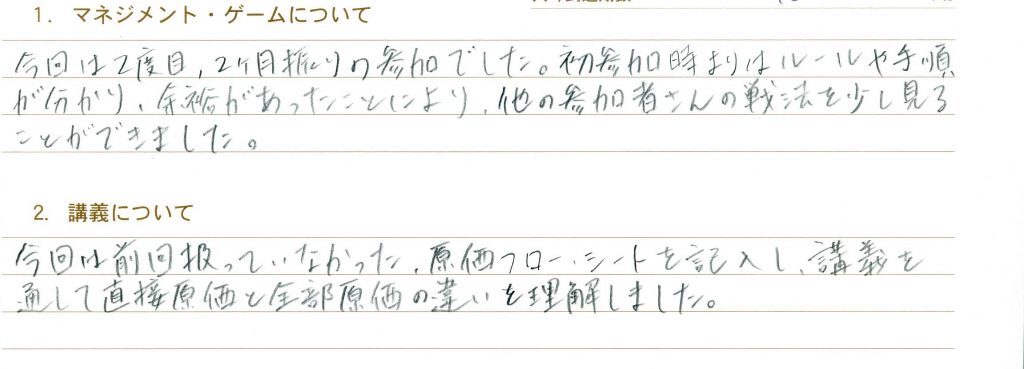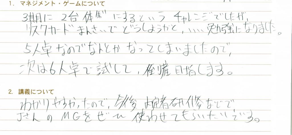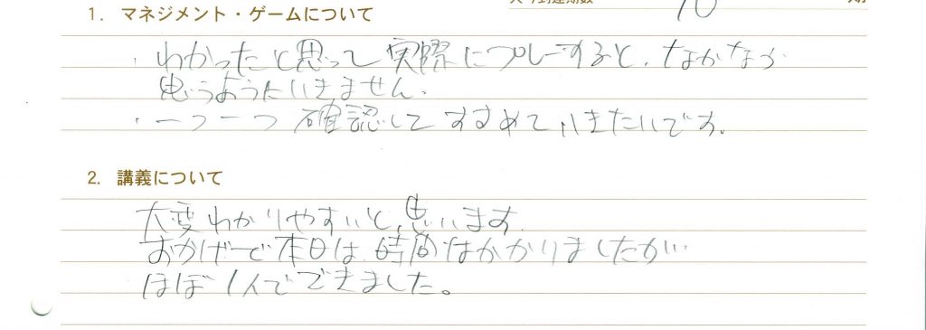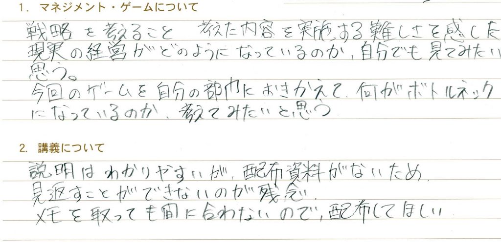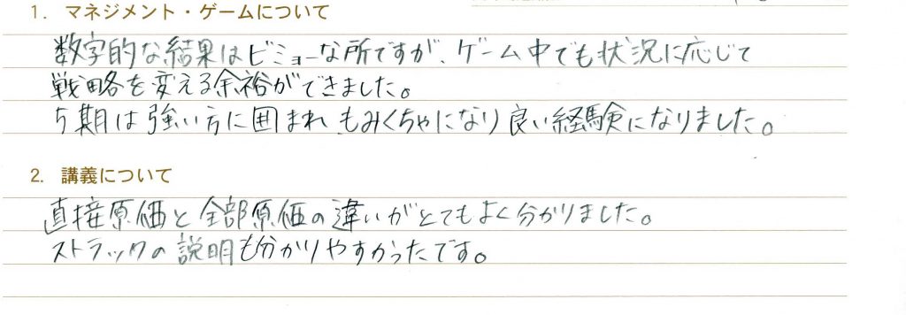 戦略を考えること教えた内容を実施する難しさを感じた。現実の経営がどのようになっているのか自分でも見てみたいと思う。今回のゲームを自分の部門におきかえて何がボトルネックになっているのか考えてみたいと思う。