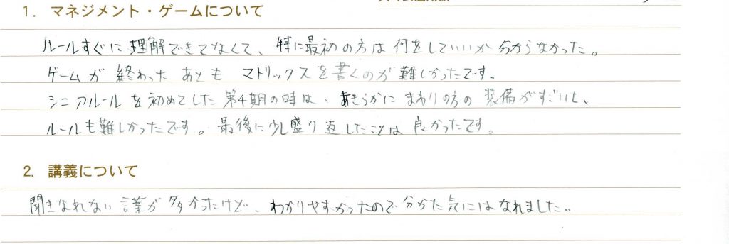 ルールすぐに理解できなくて、特に最初の方は何をしていいか分からなかった。ゲームが終わったあともマトリックスを書くのが難しかったです。シニアルールを初めてした第4期の時はあきらかにまわりの方の装備が凄いしルールも難しかったです。