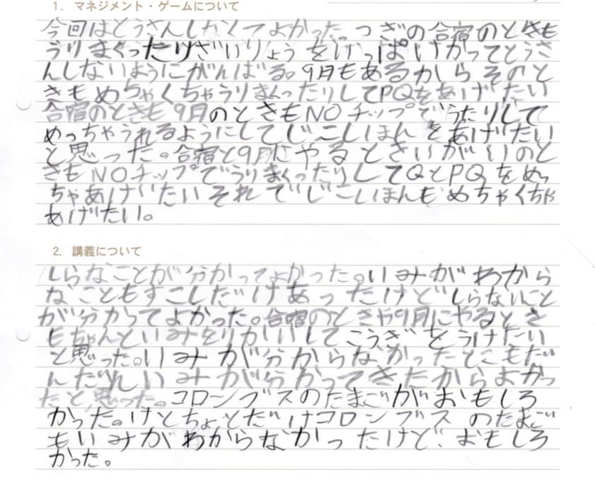 しらないことが分かってよかった。いみがわからないことも少しだけあったけどしらないことが分かってよかった。合宿のときや9月にやるときもちゃんといみをりかいしてこうぎをうけたいと思った。いみが分からなかったとこもだんだんいみが分かってきたからよかったと思った。コロンブスのたまごがおもしろかった。けどちょっとだけコロンブスもたまごもいみがわからなかったけど、おもしろかった。