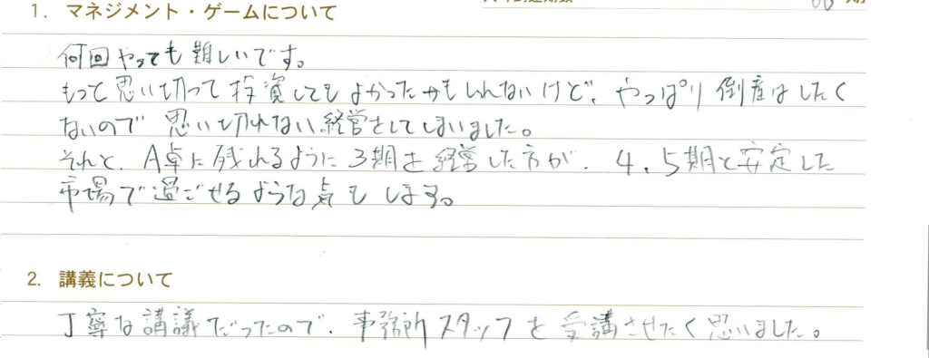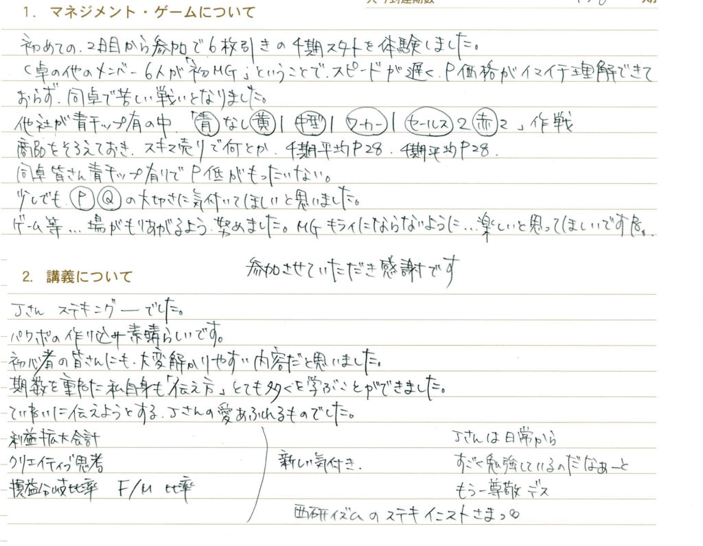 初めての2日目から参加で6枚引きの4期スタートを体験しました。C卓の他のメンバー6人が初MGということでスピードが遅くP価格がいまいち理解できておらず同卓で苦しい戦いとなりました。他社が青チップ有りの中「青なし、黄1、中型1、ワーカー1、セールス2、赤2」作戦。商品をそろえておき、隙間売で何とか4期平均P28、5期平均P28。同卓皆さん青チップありでP低がもったいない。少しでもPQの大切さに気付いてほしいと思いました。ゲーム等、場が盛り上がるよう努めました。MGキライにならないように…楽しいと思ってほしいですね。参加させて頂き感謝です。