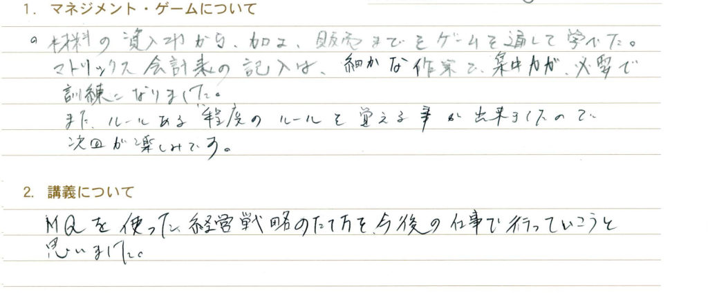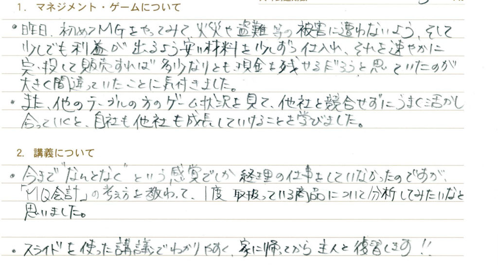 今までなんとなくという感覚でした経理の仕事をしていなかったのですが、「MQ会計」の考え方を教わって、一度取り扱っている商品について分析してみたいなと思いました。スライドを使った講義でわかりやすく、家に帰ってから主人と復習します!!