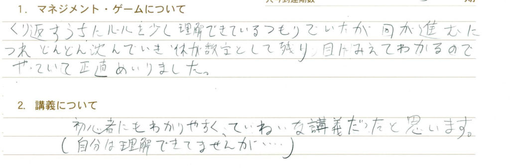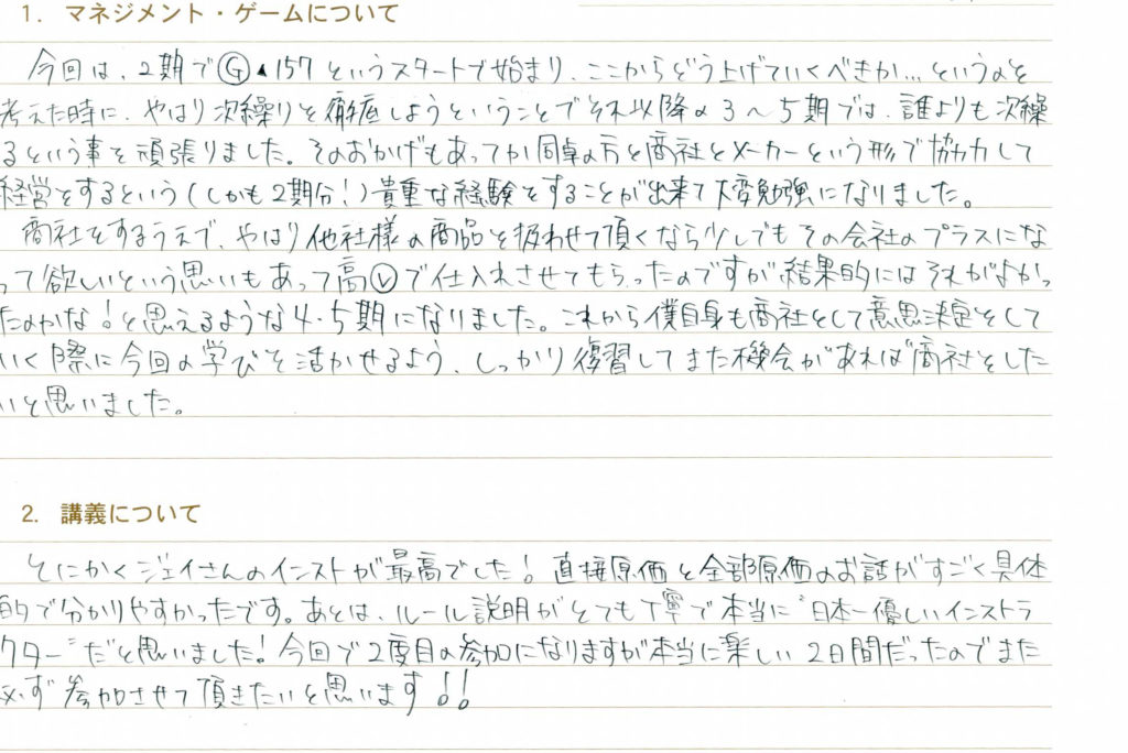 とにかくジェイさんのインストが最高でした。直接原価と全部原価のお話がすごく具体的で分かりやすかったです。あとはルール説明がとても丁寧で本当に“日本一優しいインストラクター"だと思いました!今回で2度目の参加になりますが本当に楽しい2日間だったのでまた必ず参加させて頂きたいと思います!!