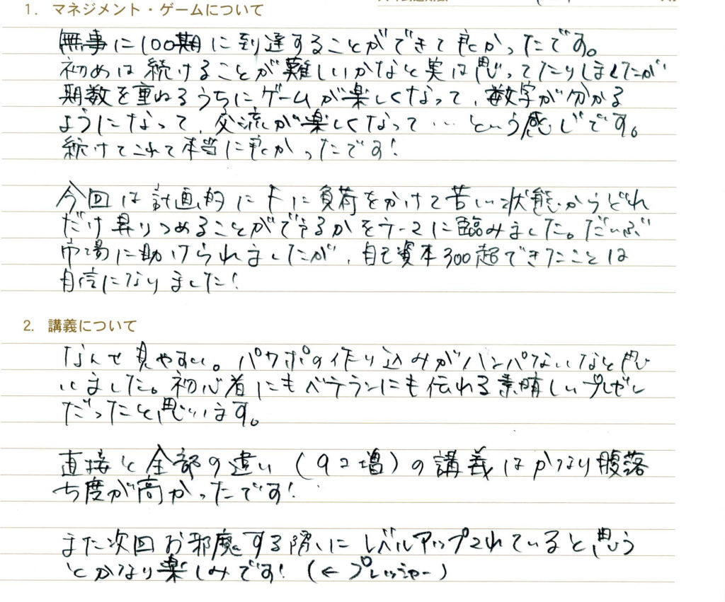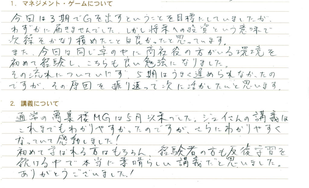 今回は3期でGを出すということを目標にしていましたが、わずかに届きませんでした。しかし将来への投資という意味で次繰をかなり積めたことは良かったと思っています。また、今回は同じ卓の中に商社役の方がいる環境を初めて経験し、こちらも良い勉強になりました。その流れについていけず5期はうまく進められなかったのですが、その原因を振り返って次に活かしたいと思います。