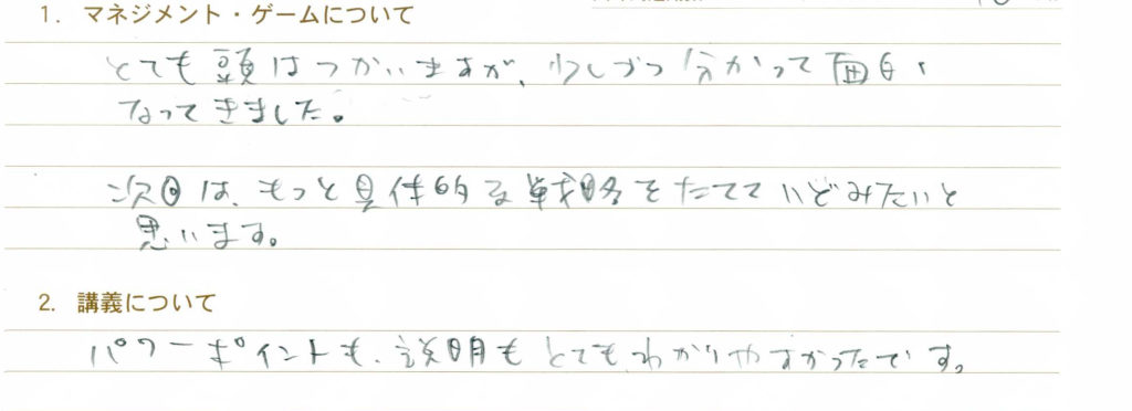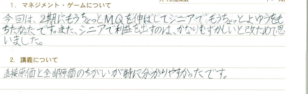 赤字を怖れていては儲けが全く出ないので初めからきちんとプランを立てて実行することが大切だと学びました。自分だけではなく相手の闘い方も読む力、その場その場に対応する力、人とうまくとりひきする力。社長さんは本当に大変でうまく設けられている一はそれだけすごいなと思いました。悔しいとかうまくいかない気持ちはたくさんありましたが楽しい気持ちはずっとあってとても楽しめました。ありがとうございました。