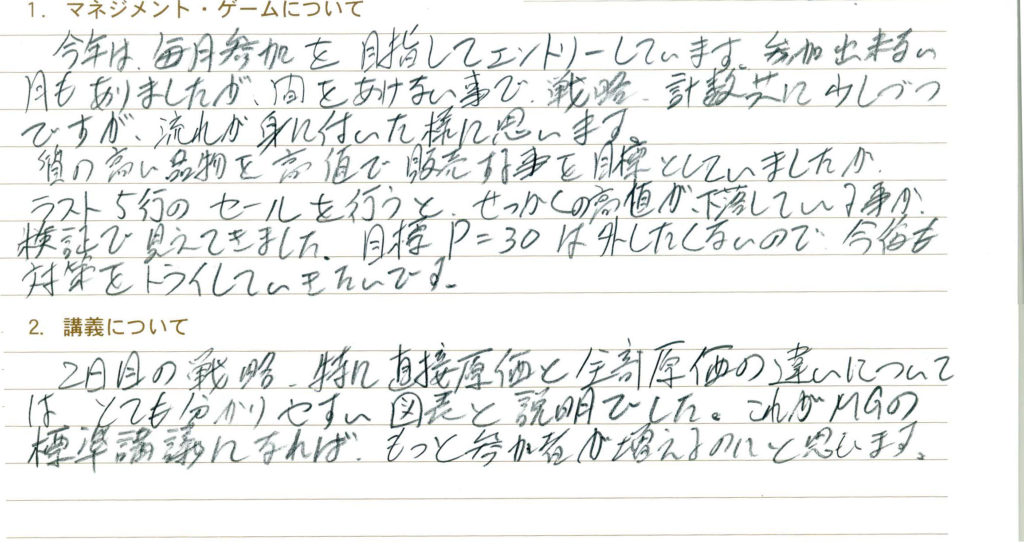 2日目の戦略特に直接原価と全部原価の違いについてはとても分かりやすい図表と説明でした。これがMGの標準講義になればもっと参加者が増えるのにと思います。