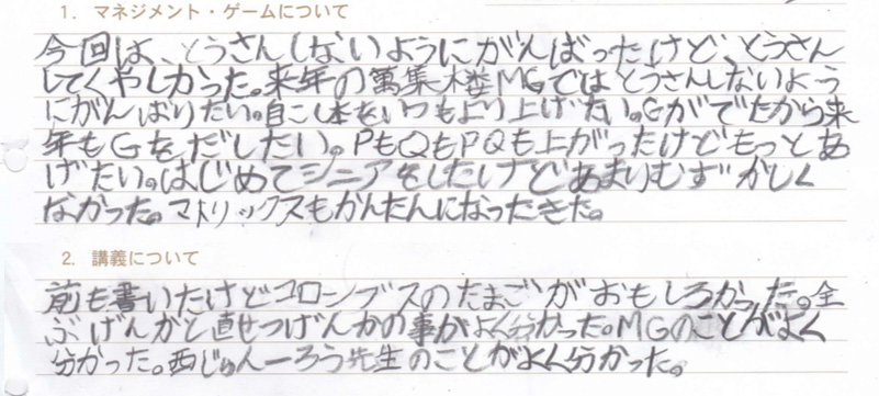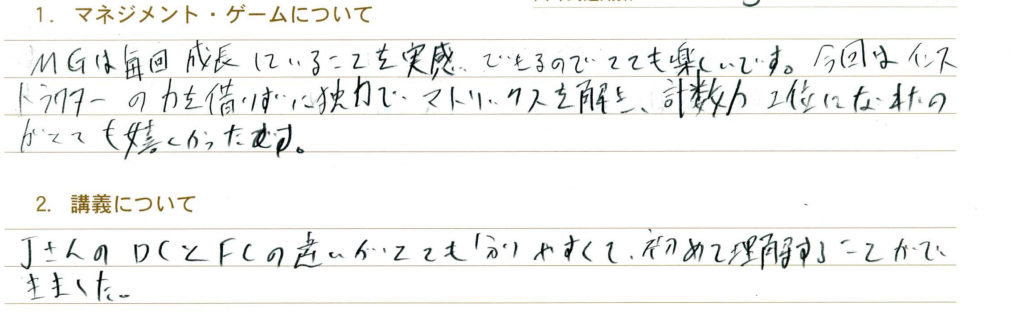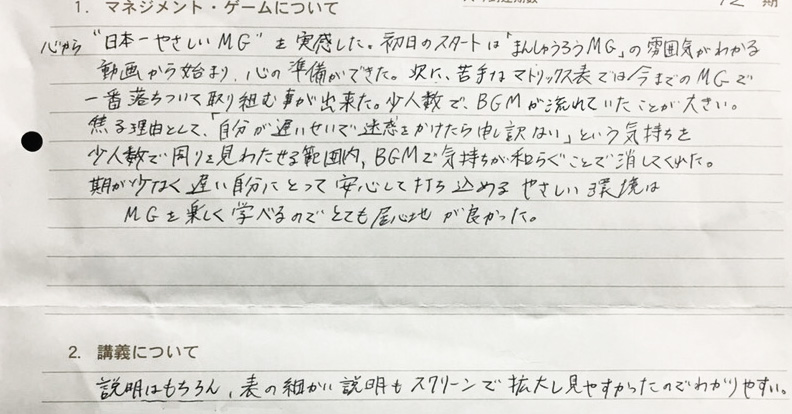 心から"日本一やさしいMG”を実感した。初日のスタートは「まんしゅうろうMG」の雰囲気がわかる動画から始まり、心の準備ができた。次に苦手なマトリックス表では今までのMGで一番落ち着いて取り組むことが出来た、少人数でBGMが流れていたことが大きい。焦る理由として「自分が遅いせいで迷惑をかけたら申し訳ない」という気持ちを少人数で周りを見渡せる範囲内、BGMで気持ちが和らぐことで消してくれた。期が少なく遅い自分にとって安心して打ち込めるやさしい環境はMGを楽しく学べるのでとても居心地が良かった。