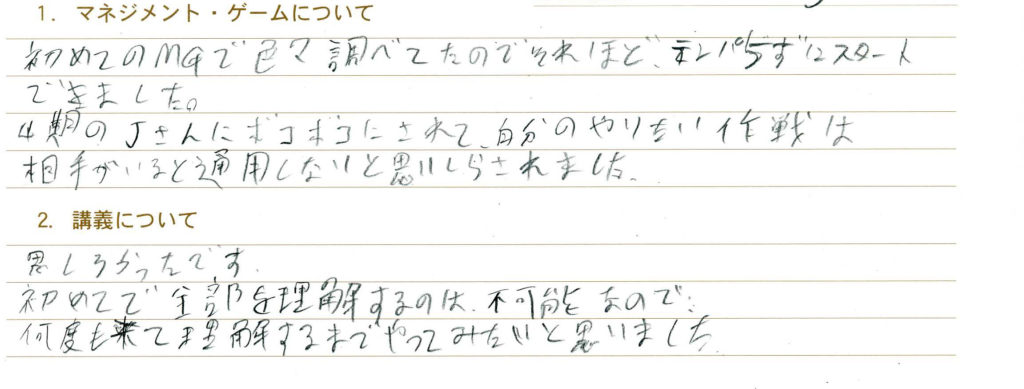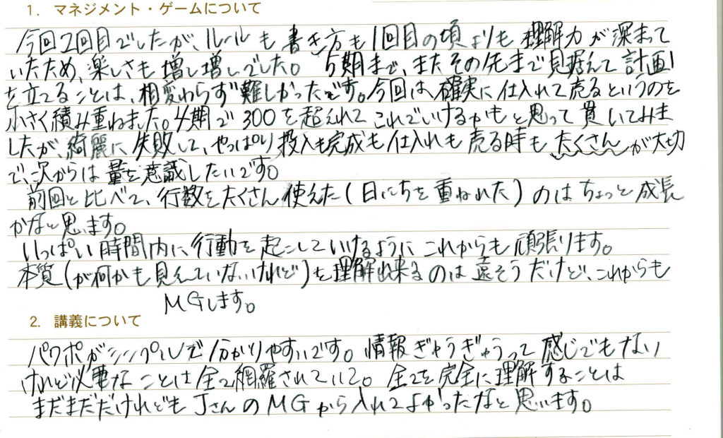 今回2回目でしたが、ルールも書き方も1回目の頃よりも理解力が深まっていたため、楽しさも増し増しでした。5期まで、またその先まで見据えて計画を立てることは、相変わらず難しかったです。今回は確実に仕入れて売るというのを小さく積み重ねました。4期で300を超えられてこれでいけるかもと思って貫いてみましたが、綺麗に失敗してやっぱり投入も完成も仕入れも売る時もたくさんが大切で次からは量を意識したいです。前回と比べて行数をたくさん使えた(日にちを重ねれた)のはちょっと成長かなと思います。いっぱい時間内に行動を起こしていけるようにこれからも頑張ります。本質(が何かも見えていないけれど)を理解できるのは遠そうだけど、これからもMGします。