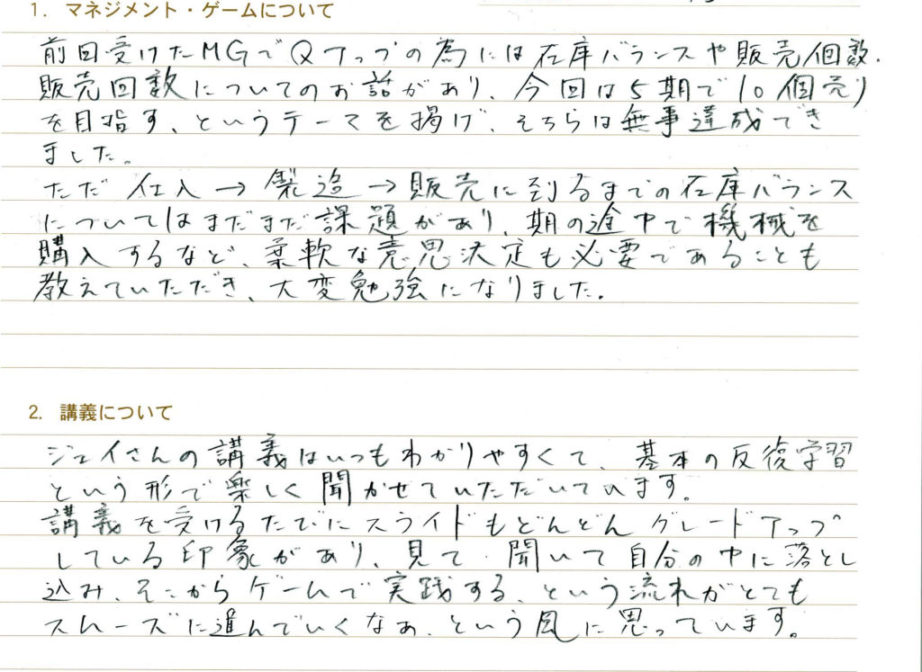 前回受けたMGでQアップの為には在庫バランスや販売個数、販売回数についてのお話があり、今回は5期で10個売りを目指すというテーマを掲げ、そちらは無事達成できました。ただ仕入れ→製造→販売に至るまでの在庫バランスについてはまだまだ課題があり、期の途中で機械を購入するなど、柔軟な意思決定も必要であることも教えていただき、大変勉強になりました。