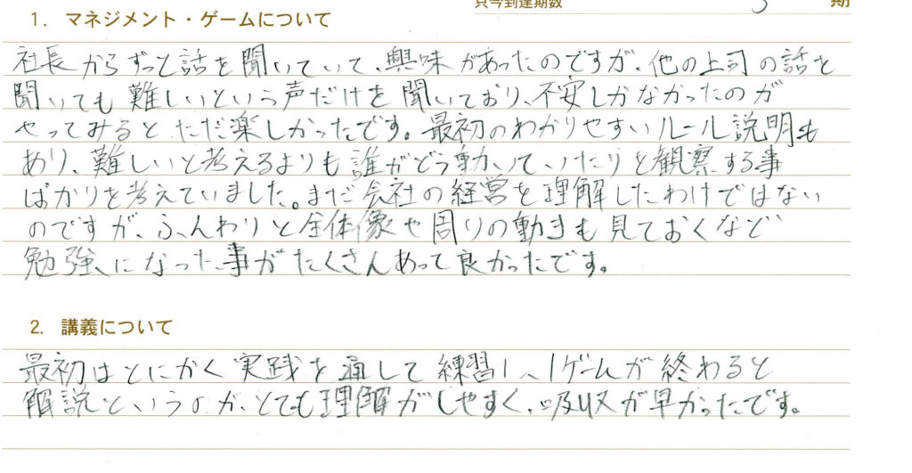 社長からずっと話を聞いていて、興味があったのですが、他の上司の話を聞いても難しいという声だけを聞いており不安しかなかったのが、やってみるとただ楽しかったです。最初のわかりやすいルール説明もあり、難しいと考えるよりも誰がどう動いていたりを観察することばかりを考えていました。まだ会社の経営を理解したわけではないですが、ふんわりと全体像や周りの動きも見ておくなど勉強になったことがたくさんあって良かったです。