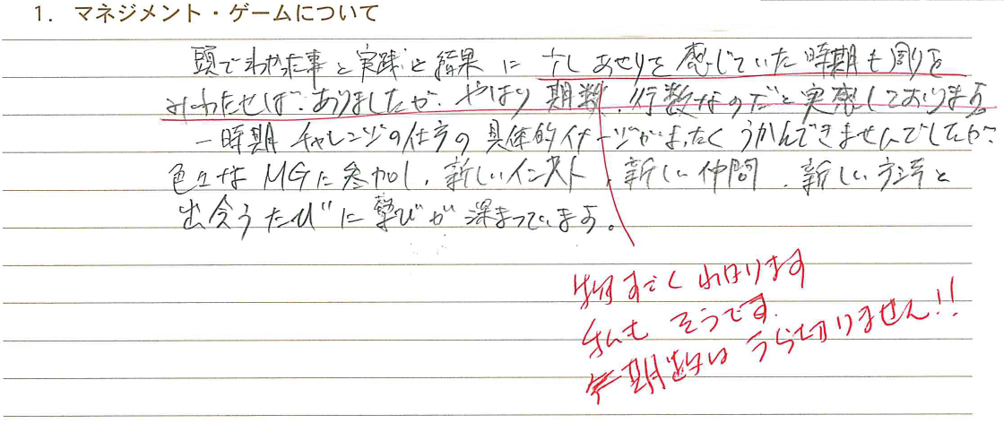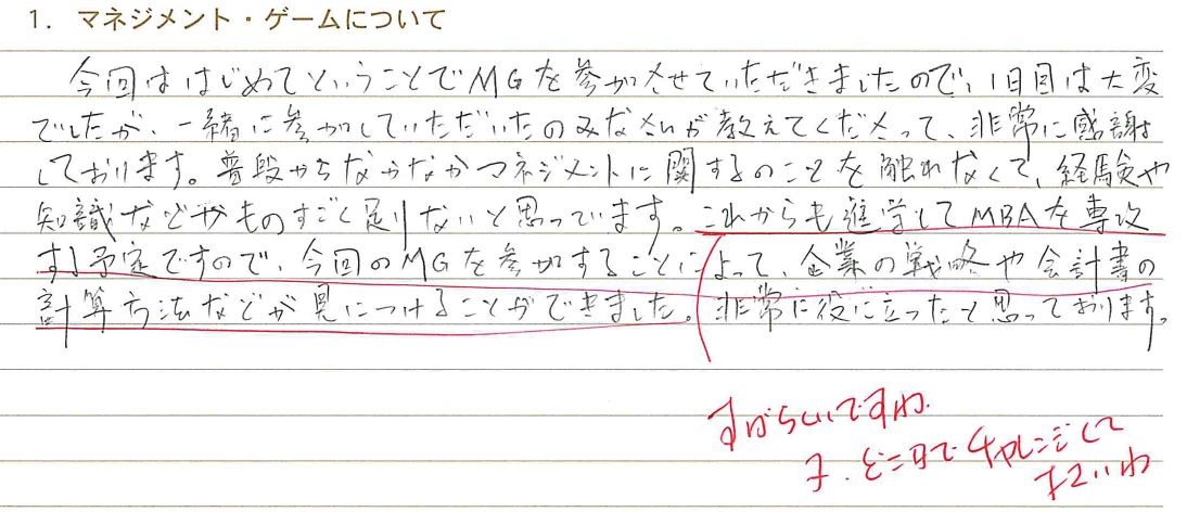 今回ははじめてということでMGを参加させていただきましたので一日目は大変でしたが、一緒に参加していただいた皆さんが教えてくださって、非常に感謝しております。普段からなかなかマネジメントに関することを触れなくて、経験や知識などがものすごく足りないと思っています。これからも進学してMBAを先行する予定ですので今回のMGを参加することによって、企業の戦略や会計書の計算方法などが身につける事ができました。非常に役に立ったと思っております。