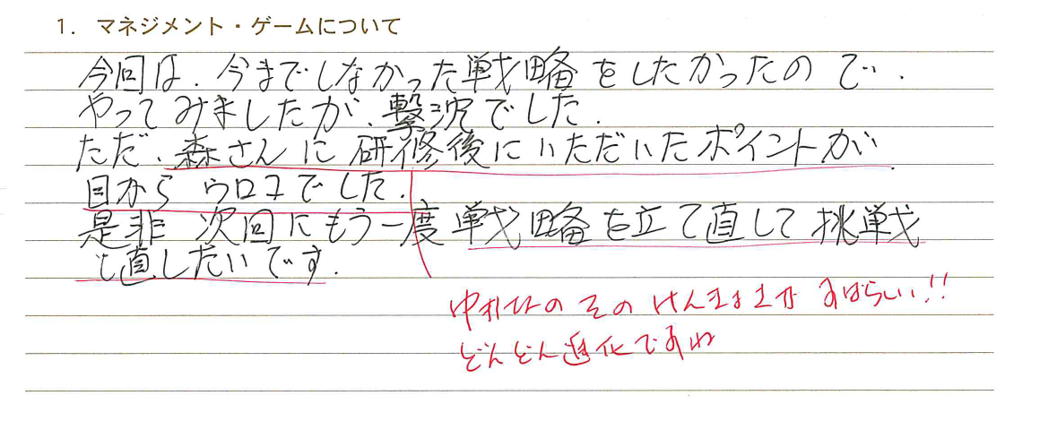今回は、今までしなかった戦略をしたかったのでやってみましたが撃沈でした。ただ森さんに研修後に頂いたポイントが目からウロコでした。是非次回にもう一度戦略を立て直して挑戦し直したいです。