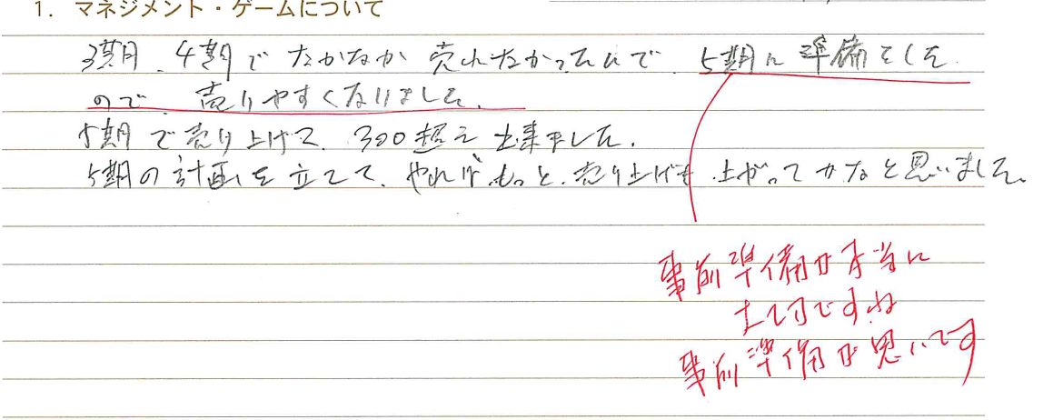 3期、4期でなかなか売れなかったんで、5期に準備をしたので売りやすくなりました。5期で売り上げて300超え出来ました。5期の計画をたててやればもっと売上も上がったかなと思いました。