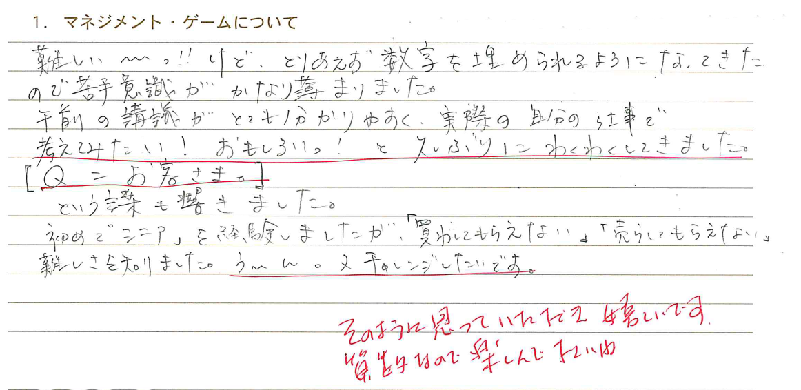 難しい〜〜〜!!けど、とりあえず数字を埋められるようになってきたので苦手意識がかなり薄まりました。午前の講義がとても分かりやすく、実際の自分の仕事で考えてみたい!おもしろいっ!と久しぶりにワクワクしてきました。【Q=お客さま】という言葉も響きました。初めてシニアを経験しましたが「買ってもらえない」「売らしてもらえない」難しさを知りました。う〜ん。又チャレンジしたいです。
