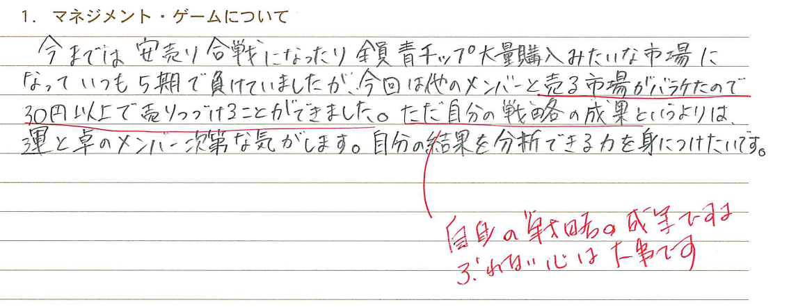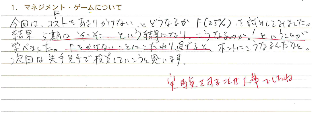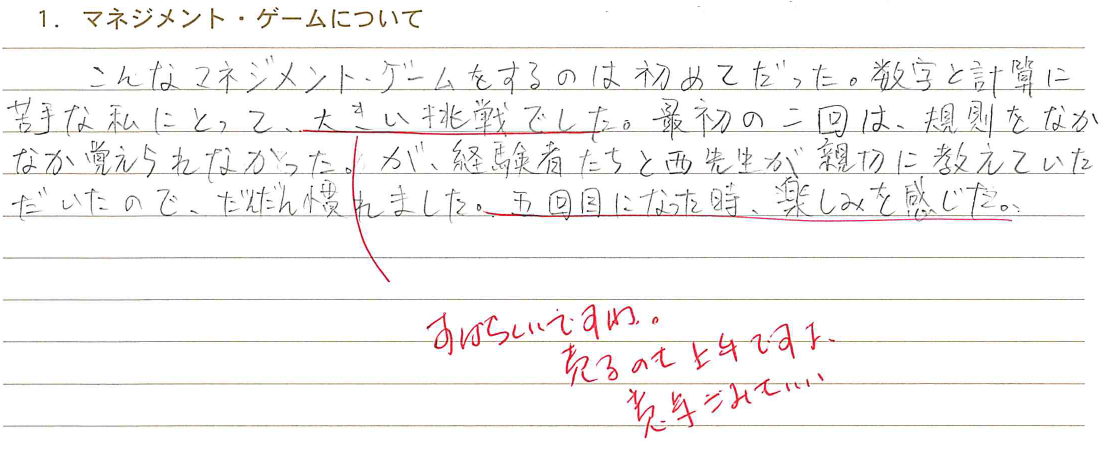 こんなマネジメントゲームをするのは初めてだった。数字と計算が苦手な私にとって大きい挑戦でした。最初に2回は規則をなかなか覚えられなかったが、経験者たちと西先生が親切に教えていただいたのでだんだん慣れました。5回目になった時楽しみを感じた。