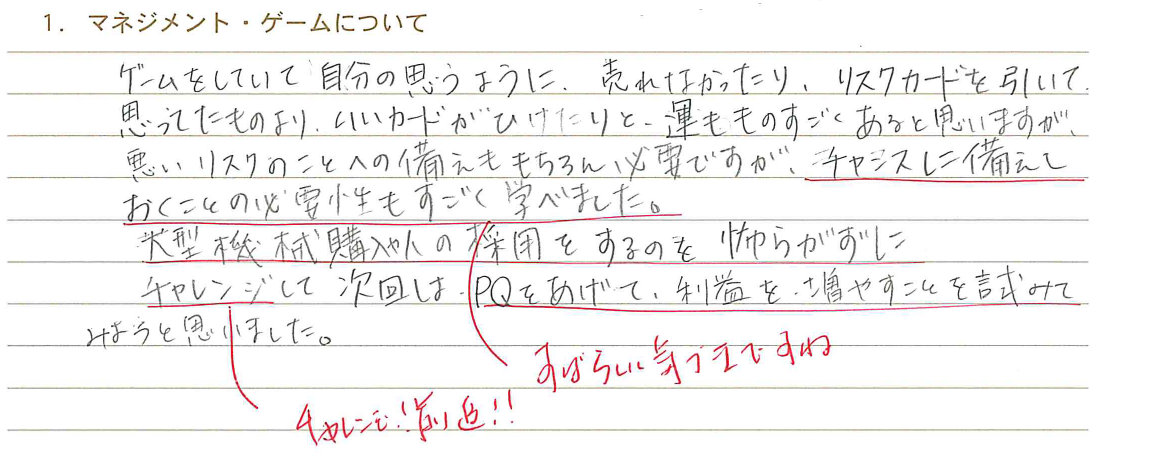 ゲームをしていて自分の思うように売れなかったり、リスクカードを引いて思ってたものよりいいカードが引けたりと、運もものすごくあると思いますが、悪いリスクのことへの備えももちろん必要ですが、チャンスに備えておくことの必要性もすごく学べました。大型機械購入や人の採用をするのを怖がらずにチャレンジして次回はPQをあげて利益を増やすことを試してみようと思いました。