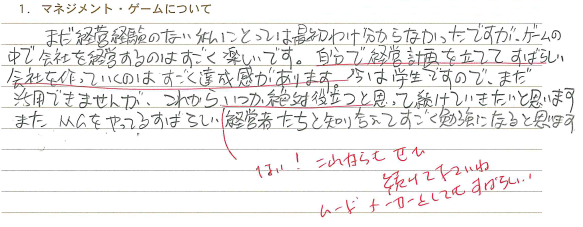 まだ経営経験のない私にとっては最初わけが分からなかったですが、ゲーム中で会社を経営するのはすごく楽しいです。自分で経営計画を立てて素晴らしい会社を作っていくのはすごく達成感があります。今は学生ですのでまだ活用できませんが、これからいつか絶対役立つと思って続けていきたいと思います。またMGをやってる素晴らしい経営者たちと知り合えて凄く勉強になると思います。