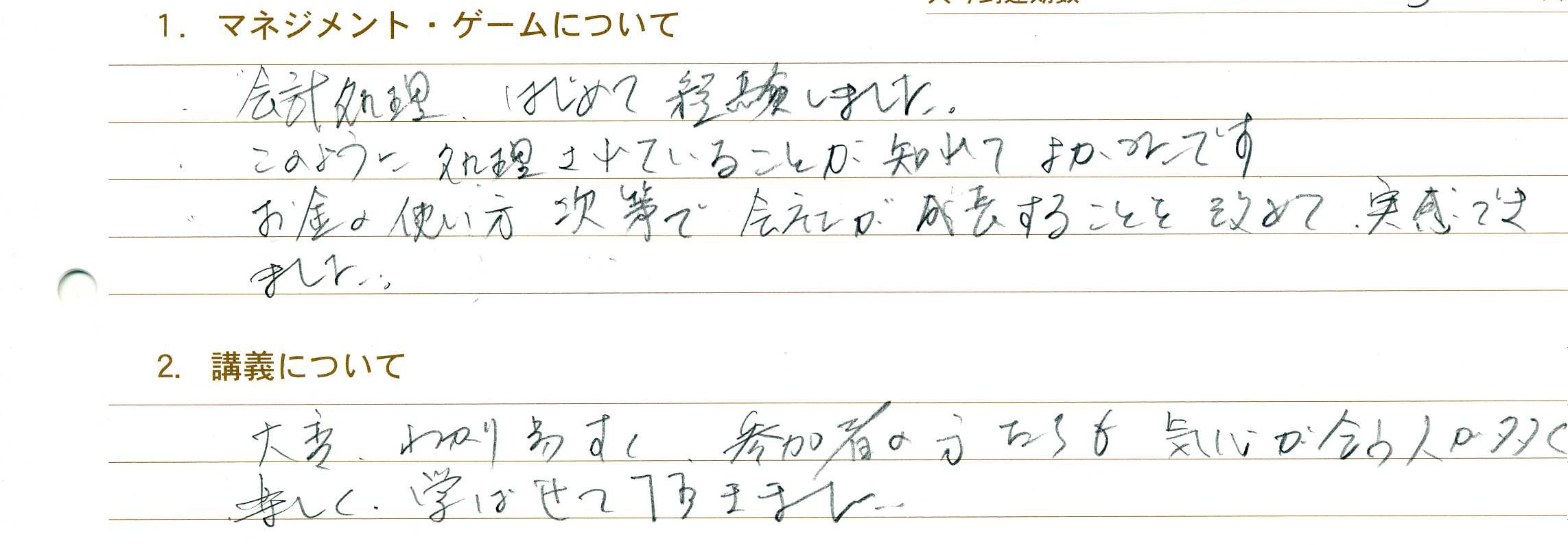 会計処理はじめて経験しました。このように処理されていることが知れてよかったです。お金の使い方次第で会社が成長することを改めて実感できました。