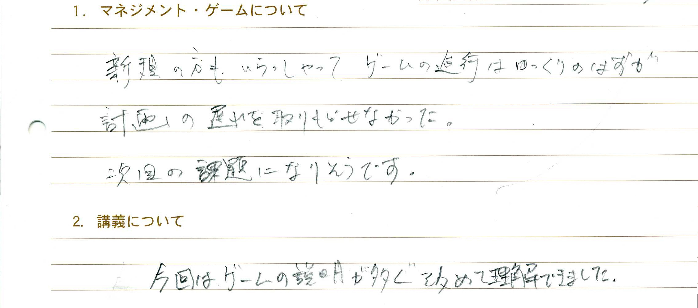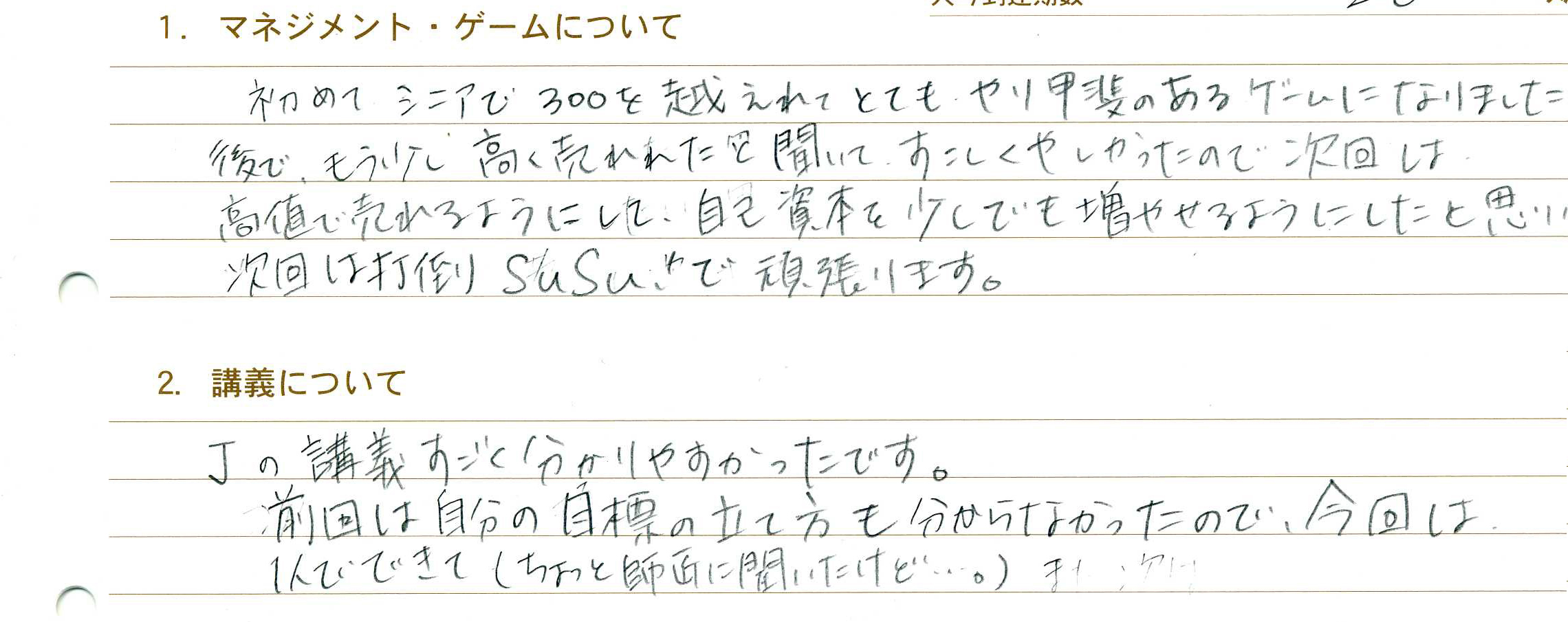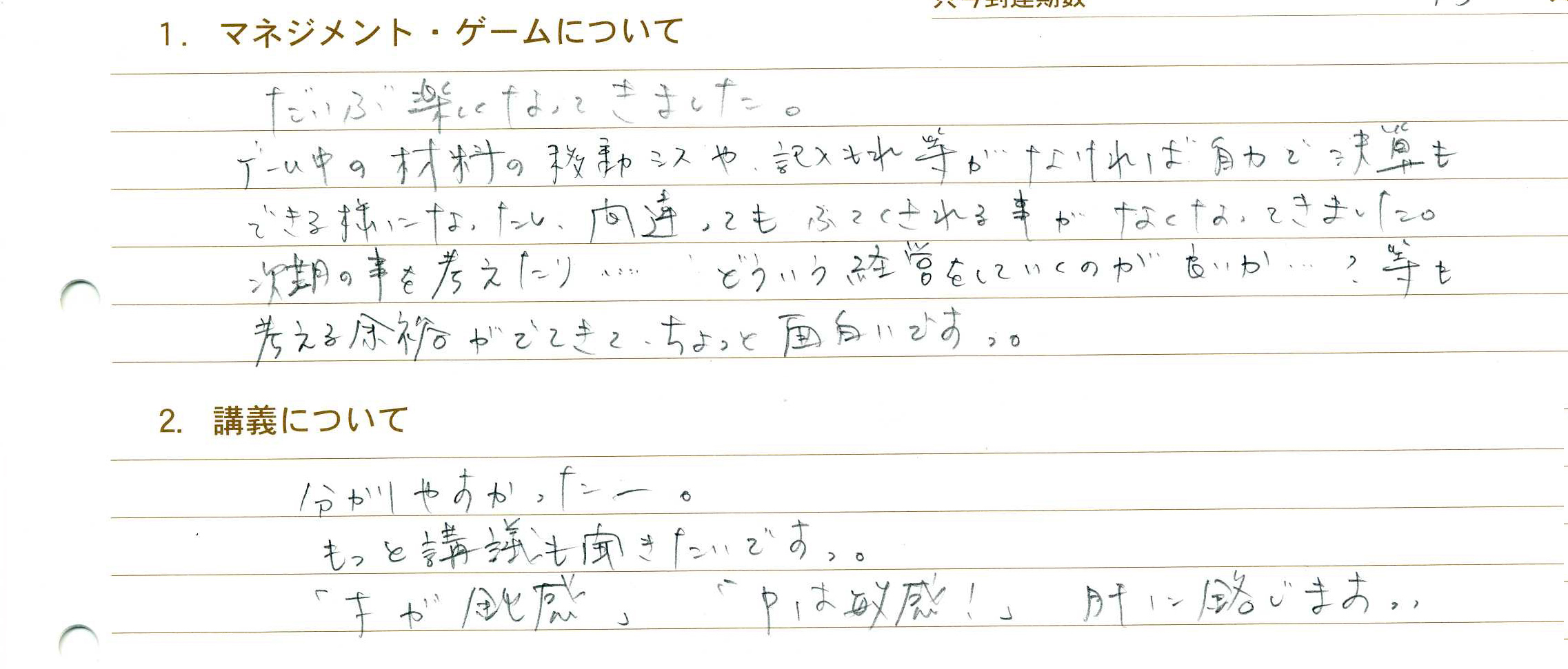 だいぶ楽しくなってきました。ゲームの材料の移動ミスや記入漏れ等がなければ自力で決算もできるようになったし、間違ってもふてくされる事がなくなってきました。次期の事を考えたり、どういう経営をしていくのが良いか?等も考える余裕がでてきてちょっと面白いです。