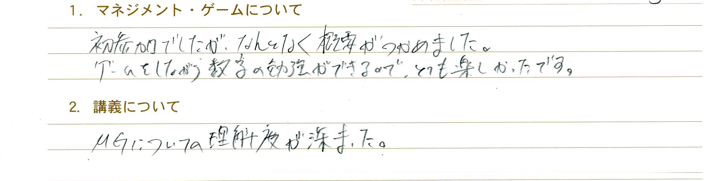大変わかりやすく参加者の方たちも気心が合う人が多く、楽しく学ばせていただきました。