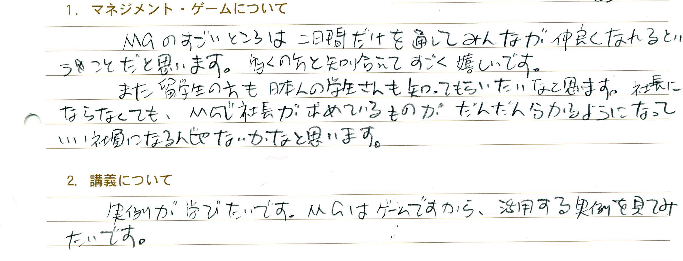 MGのすごいところは2日間だけを通してみんなが仲良くなれるということだと思います。多くの方と知り合えてすごく嬉しいです。また留学生の方も日本人の学生さんも知ってもらいたいなと思います。社長にならなくてもMGで社長が求められているものがだんだん分かるようになっていい社員になるんじゃないかなと思います。